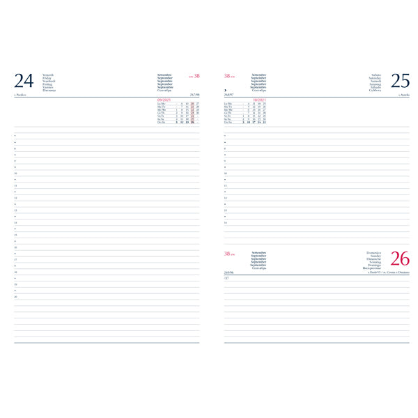 Agenda giornaliera a blocco fisso, copertina in carta imbottita, carta bianca con stampa a due colori. Sabato/Domenica abbinati.